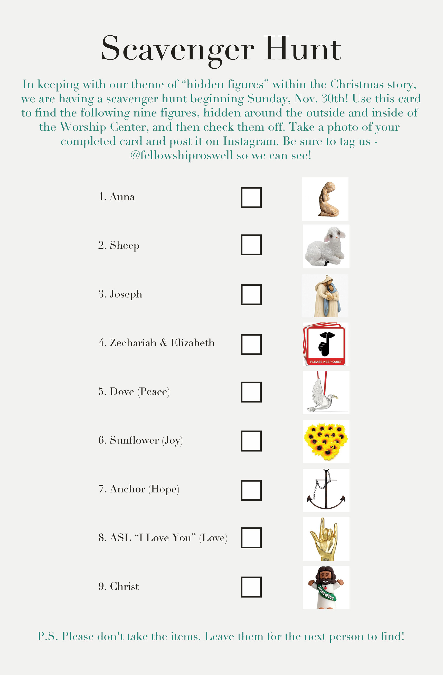 We are so excited for Advent at Fellowship this year! Pastor Jason will be exploring "hidden figures" from the Christmas story — those that play important roles in the birth of our Savior, but are often overlooked. In keeping with this theme, we'll have a church-wide scavenger hunt that you'll learn more about on Nov. 30th.